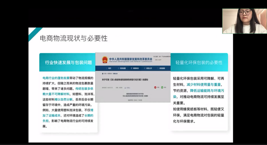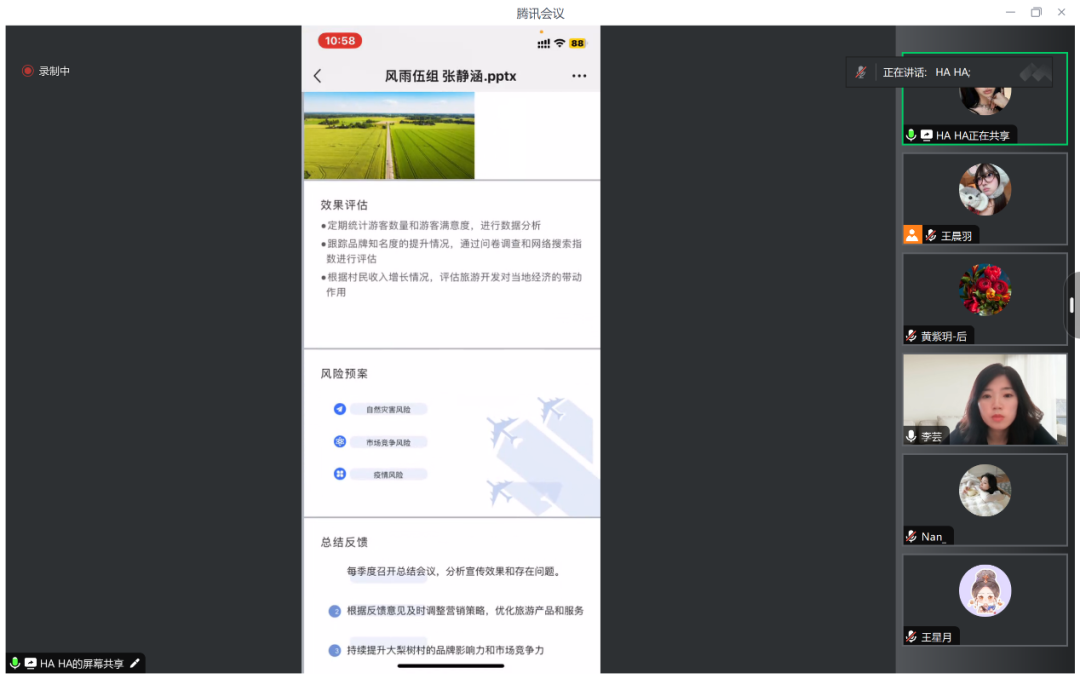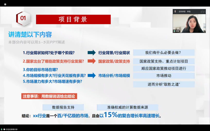 随后,风雨伍组张静涵团队和专业打灰李思瑶团队两支参赛队伍进行了线上模拟路演。两支队伍的负责人分别展示了准备的项目,从项目背景、市场分析、产品或服务介绍,到营销策略、财务规划等全方面的呈现了项目的可行性与创新性。