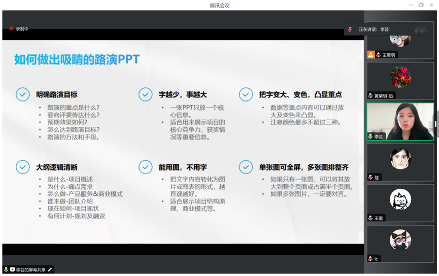 会议伊始,李芸老师就“如何做好路演ppt”做了详细的讲解,并将路演PPT中必须包含的八大部分逐一进行了介绍。李芸老师强调内容要逻辑清晰、重点突出,以简洁明了的方式传达项目核心亮点。同时,还分享了许多实用的设计技巧,如色彩搭配、图表应用等,让PPT在视觉上更具吸引力。