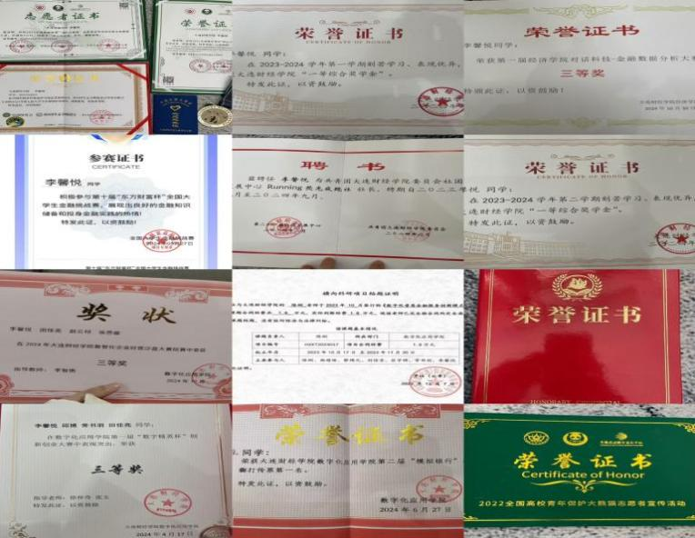 她认为不仅要在学习上认真求实,同时也要致力于学以致用。李鑫悦积极投身于金融精英挑战杯、互联网 +、iCAN 创新创业等大赛,在市场分析和路演环节展现出出色的才能并获得三等奖;参与横向科研团队项目,认真负责资料整理工作,收获颇丰。同时,在校积极参与社团活动,担任班级文艺委员及夜跑社社长,锻炼了组织管理能力,以乐观向上的态度面对学习与生活中的挑战,不断成长进步,为未来的职业发展奠定了坚实基础。