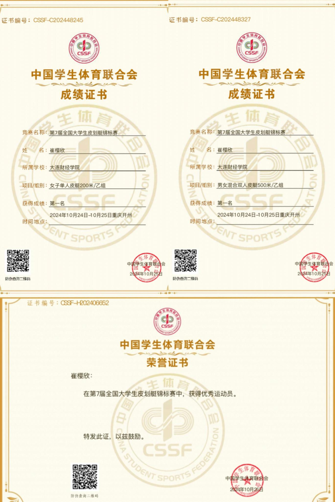 在知识的海洋里,崔樱欣愿意做浪潮的排头,在课堂上,她全神贯注,笔记详实,钻研难题不倦,每当遇到难以理解的知识,她都会向老师请教,直至理解,也正因为这股子钻牛角尖的“劲”儿,她的成绩稳居专业前十,真正地让知识入心入脑。课余时间,她投身操场,跑道上挥汗如雨,泳池里劈波斩浪,凭借顽强毅力与精湛技艺,多次在体育赛事斩获佳绩。2024年8月,崔樱欣同学在学校的组织下前往广东省汕尾市参加为期一个月的龙舟赛训练,青山不负人,崔樱欣终取得了绿湖岛全国高校皮划艇公开赛女子组全国第八名、2024年8月全国青少年龙舟锦标赛U23甲组团体三等奖、2024年10月第七届全国大学生皮划艇锦标赛冠军、单人200米皮划艇全国冠军、男女混双皮划艇500m全国冠军荣誉。