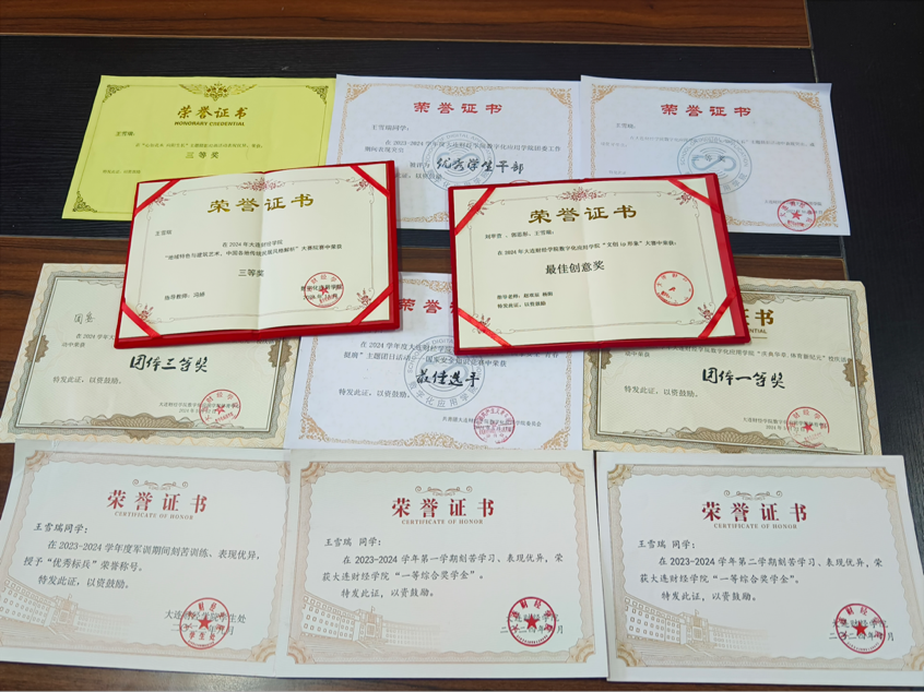 学如弓弩,才如箭镞,识以领之,方能中鹄。对于专业课的学习,王雪瑞同学满怀热忱,脚踏实地,积极进取,连续两学期获得大连财经学院“一等综合奖学金”。同时,她将课内所学服务于课外竞赛与活动,收获颇丰,分别在大连财经学院数字化应用学院“文创ip 形象”大赛中荣获“最佳创意奖”;数字化应用学院主办的“地域特色与建筑艺术,中国各地传统民居风格解析大赛”中“荣获三等奖”;数字化应用学院“庆典华章,体育新纪元活动”中荣获“团体一等奖”;数字化应用学院“国家安全,青春挺膺”主题团日活动中荣获“最佳选手”;第五届全国建筑类校钢筋平法应用技能大赛和全国Bim竞赛中取得优异的成绩。过往的每一项荣誉与成绩,皆化作她前行路上的熠熠星光,照亮并鞭策着她在追求卓越的道路上永不止息,向着更高远的目标前行。