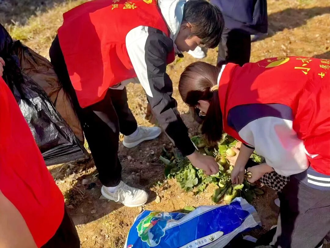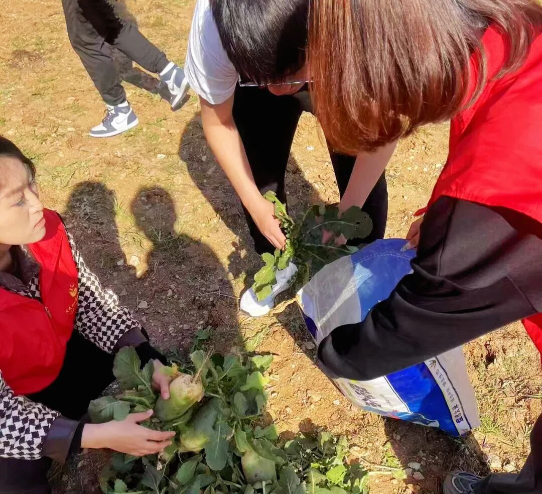 中午时分志愿者们一同到达试验田,便迅速的投入到了劳动活动当中,用锄头和铲子甚至双手将萝卜尽数挖出,劳动现场气氛热烈,大家相互协作,配合默契,还时不时交流劳动经验,经过几个小时的努力,试验田里一片丰收的景象,满载着希望的萝卜被整齐地码放在一旁。