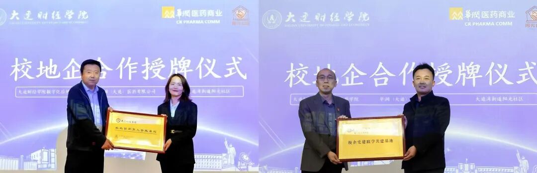 随后,大连财经学院数字化应用学院与华润(大连)医药有限公司和大连湾街道阳光社区进行了“校地企 党建联学 协同育人”授牌仪式。
