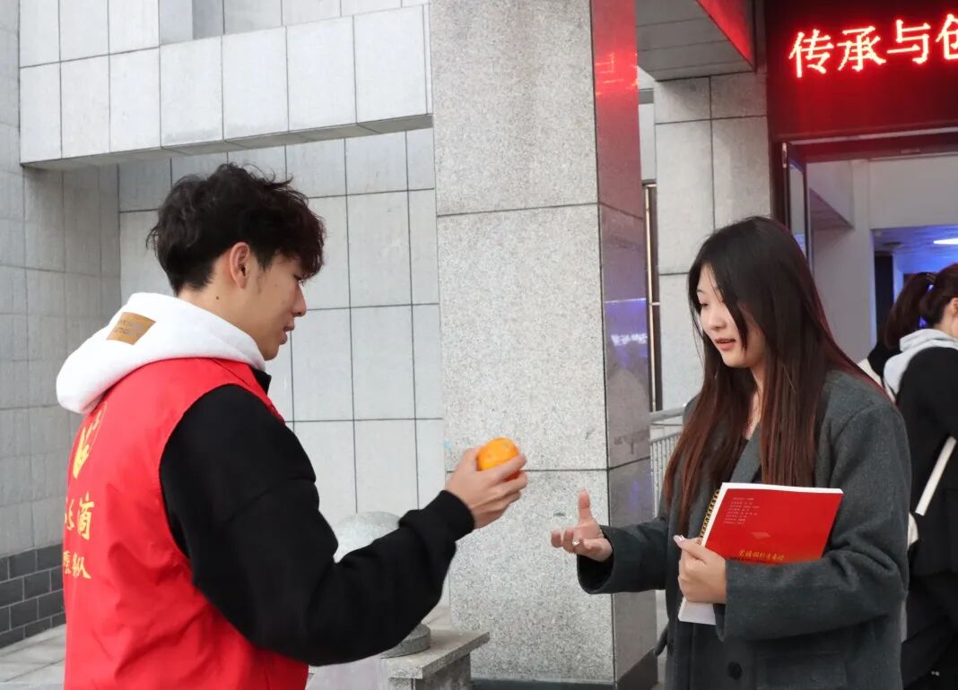 寒意悄然而至,盖住了整个城市。在这丰收的季节里,志愿服务队延续传统习俗,仿照"霜降三吃"共享美味,为同学们准备了多样成熟果实,亦是为大家送温暖。