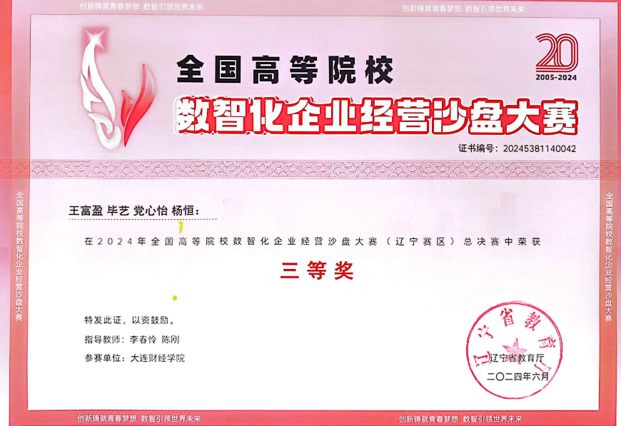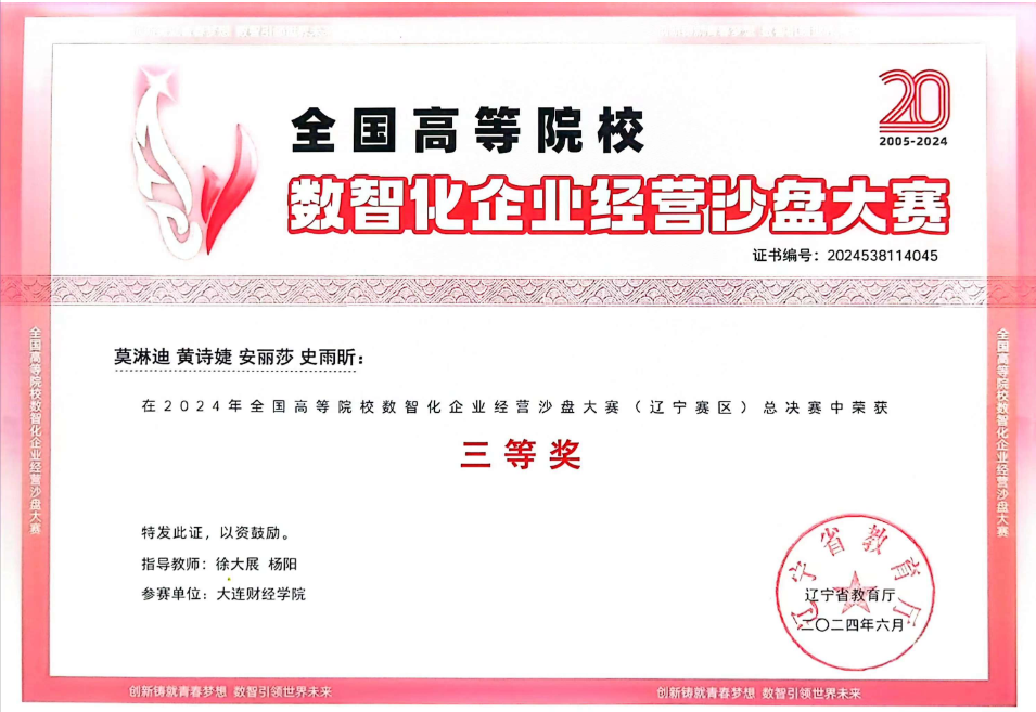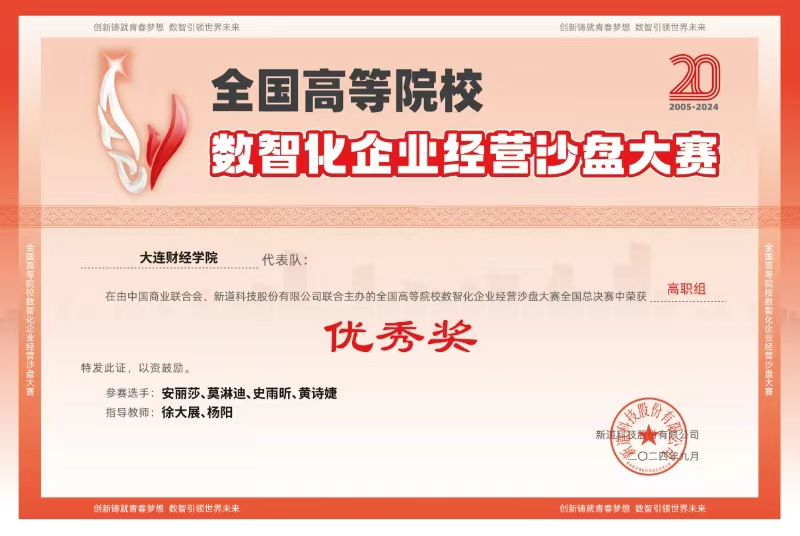 由辽宁省教育厅主办,东北财经大学、辽宁农业职业技术学院承办,新道科技股份有限公司提供技术支持的2024年全国高等院校数智化企业经营沙盘大赛(辽宁赛区)顺利落幕,我校数字化应用学院派出的两支队伍分别荣获高职组赛道三等奖。